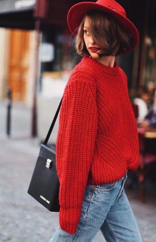 לבוש יומיומי ועם זאת מלא בסטייל ונראה נטול מאמץ כובע, שפתיים וסוודר בצבע אדום (pinterest)