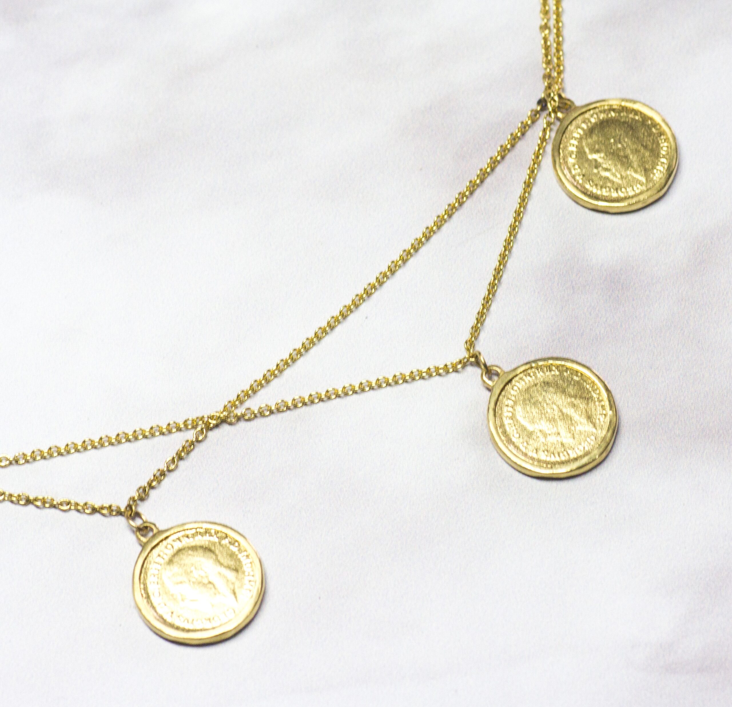 צמיד שבנוי מ2 שרשראות ועליהן תלויים 3 מטבעות זהב